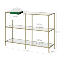 Giv entré, stue eller soveværelse et let og moderne udtryk med dette VASAGLE konsolbord. De tre hylder i hærdet glas og den slanke stålramme i guldfarve skaber et luftigt look, der løfter indretningen og giver plads til både dekorationer, planter og bøger. Med en længde på 100 cm har du rigelig plads til at fremvise dine favoritter uden at fylde rummet.