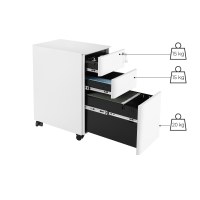 Skabet leveres med en bakke til skriveredskaber og en skinne til hængemapper, så du hurtigt kan indrette din personlige opbevaring. De to øverste skuffer kan bære op til 15 kg hver, mens den store bundskuffe klarer op til 20 kg.