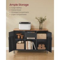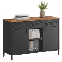 Giv hjemmet et stilrent løft med dette alsidige opbevaringsskab i rustik brun og mat sort. Det kombinerer en varm trælook-bordplade med et moderne metalskab og passer lige godt som sideboard i køkkenet, tv-møbel i stuen eller ekstra opbevaring på kontoret. Bordpladen rummer fx kaffemaskine eller mikroovn, mens en praktisk skuffe holder styr på småting.