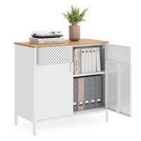 Det multifunktionelle perforerede felt giver god ventilation og kan bruges med kroge (medfølger ikke), så nøgler, høretelefoner eller viskestykker kan hænge inden i skabet. Den glatte korpus i stål gør det nemt at rengøre – tør blot overfladerne af for at holde dem pæne. Skabet passer ind i mange rum: som skænk i spisestuen, TV-bord i stuen eller diskret opbevaring i entre og kontor. Ikke egnet til udendørs brug.