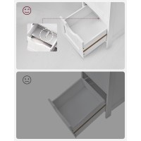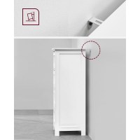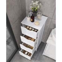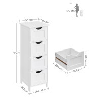 Skabet er fremstillet i MDF for stabilitet og leveres med anti-tip-enhed for ekstra sikkerhed. De fire praktiske skuffer gør det let at organisere alt fra toiletartikler til nøgler og kontorsager. En pladsbesparende opbevaringsløsning, der blender ind i en lys, landlig stil.