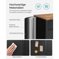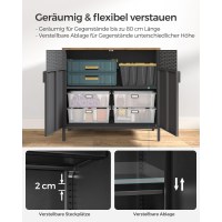 Inde i skabet finder du en justerbar hylde, så du kan tilpasse højden efter dine ting. De dobbelte døre lukkes nemt med magnetlukning, og de justerbare fødder hjælper skabet med at stå stabilt, også på let ujævne gulve. Den robuste konstruktion i spånplade og stål giver en solid løsning til hverdagens opbevaring.