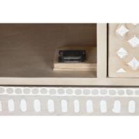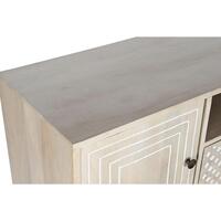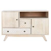 Skab varm atmosfære og praktisk opbevaring med denne skænk i mangotræ fra DKD Home Decor. Det naturlige træ i kombination med hvide, dekorative mønstre giver et let boho-udtryk, der passer perfekt i moderne nordiske hjem. Med to døre, to skuffer og en åben hylde får du plads til både hverdagens ting og dine yndlingsdekorationer.