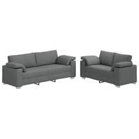 Dette sofasæt kommer med en 2-personers og en 3-personers sofa, begge med et smart moderne design, der passer godt ind i stuer og soveværelser. Den stilfulde mørkegrå stofpolstring og de solide træarmlæn giver dig komfort og stil, så dit rum føles hyggeligt og indbydende.