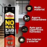 Pattex No Más Clavos - en **alsidig montagelim** til reparationer og samlinger i hjemmet eller på arbejdet. Den hvide pasta er uden opløsningsmidler og nem at påføre præcist uden dryp, så du får et pænt og rent resultat - både inde og ude. Limen har **fremragende initialt greb** og hæfter på mange overflader, så du kan montere sikkert og praktisk i forskellige miljøer.