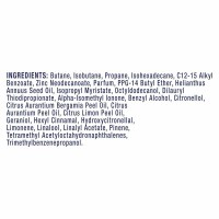 Udvalgte ingredienser: PPG-14 butyl ether, Propane, Alpha-isomethyl ionone, Butane, C12-15 alkyl benzoate, Citronellol, Hexyl cinnamal, Hydroxycitronellal, Isobutane, Isohexadecane, Isopropyl myristate, Limonene, Linalool, Octyldodecanol, Benzyl alcohol, Geraniol, Helianthus annuus seed oil, Parfum, Linalyl acetate, Pinene, Tetramethyl acetyloctahydronaphthalenes.