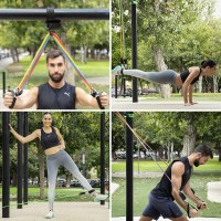 Modstandsbåndene kommer i fem farver med klare modstande: gul 4,5 kg, rød 9 kg, grøn 13,5 kg, blå 18 kg og sort 22,5 kg. Med metal-karabinhager, skumhåndtag, ankelstropper og døranker kan du let skifte øvelser og modstand. Den vibrerende platform har skridsikker base med akupressurpunkter, fjernbetjent armbånd og praktisk timer til daglig brug op til 15 minutter.