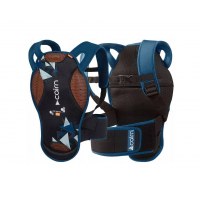 Den åndbare opbygning og polstring i EVA giver behagelig ventilation, mens de blå og sorte flader er prydet med trekantmotiver for et sporty look. Produktet er en klassisk rygbeskytter med taljebælte og justerbare seler, der gør det nemt at få den rigtige pasform til junior.