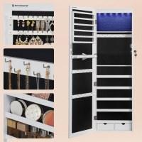 Få styr på hverdagens smykker med dette elegante, vægmonterede smykkeskab fra SONGMICS. Den slanke front med spejl gør det nemt at tjekke dit look, mens det rummelige indre holder alt fra ringe og øreringe til halskæder pænt organiseret. Skabet er låsbart, så dine favoritter kan opbevares trygt, og den pladsbesparende montering på væg eller dør passer perfekt i soveværelset, garderoben eller entréen.