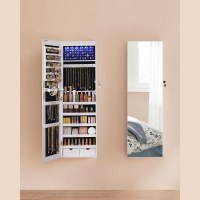 Det låsbare skab rummer alt fra hverdagsfavoritter til festlige accessoires: 84 ringpladser, 32 kroge til halskæder, 48 huller og 90 pladser til øreringe, 1 tørklædestang, 5 hylder samt 2 skuffer til dine skønhedshemmeligheder. Den gennemførte indretning gør det let at holde orden og beskytter dine smykker mod filtrering og støv.