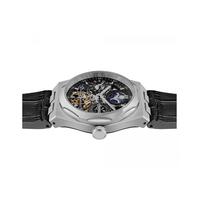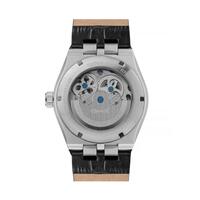 Den detaljerede urskive prydes af fine visere, tydelig minutring og dekorative komplikationer, der tilfører dybde. I toppen ses en måne/sol-detalje, som giver uret et unikt præg. Kombinationen af en blank sølvfarvet kasse og den strukturerede, mørke rem skaber et udtryk, der matcher alt fra jakkesæt til jeans.