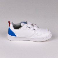 Skoen er designet i polyester og polyuretan, som er lette materialer til daglig brug. Den alsidige hvide farve med blå og røde detaljer passer til det meste børnetøj og er oplagt som børnesneakers til både leg og fritid.